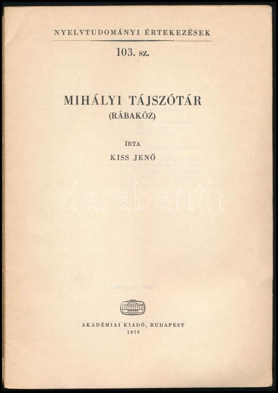Kiss JenÅ‘: Mihályi tájszótár. (Rábaköz). Nyelvtudományi Értekezések 103. sz. Bp., 1979, Akadémiai Kiadó, 76+(4) p. Kiadói papÃrkötés, sérült borÃtóval, helyenként kis lapszéli sérülésekkel.