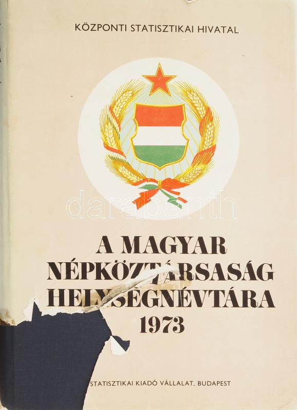 Magyar Népköztársaság helységnévtára 1973. Bp., 1973, KSH. Változatlan utánnyomás. Magyar Népköztársaság Államigazgatási térképe melléklettel. Kiadói aranyozott egészvászon-kötésben, kiadói sérült, hiányos és ragasztott papír védőborítóval.