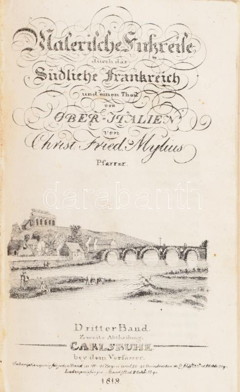 Description: Mylius, Christian Friedrich: Malerische Fußreise durch das südliche Frankreich und einen Theil von Ober-Italien von - - - Pfarrer. Dritter Band. Carlsruhe, 1819, Szerzői kiadás [bey dem Verfasser], 2+290+2+419 p. Német nyelven. Korabeli félbőr-kötés, kopott borítóval, a hátsó tábla belsején a papír részben feljött.