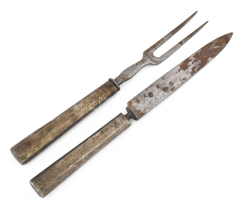 Ezüst (Ag) nyelű antik szervírozóvilla és kés, végén monogramos vésettel, bruttó: 180g