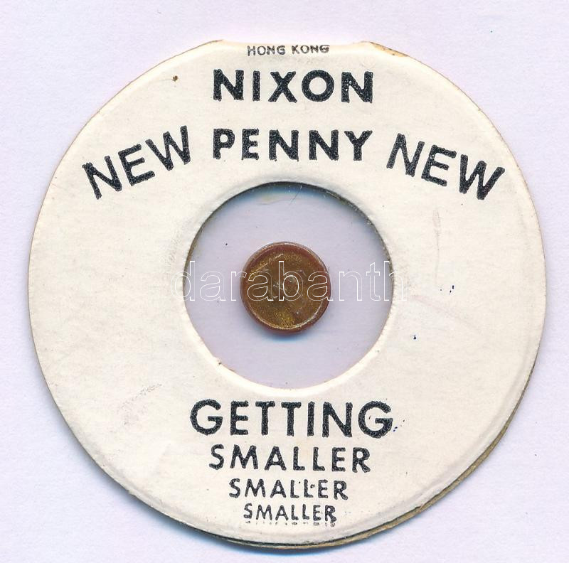 Amerikai Egyesült Államok ~1970. 1c "Nixon New Penny" bronz ... https://www.darabanth.com/en/469-Online-auction/469.0/Numismatics/Emergency-Coins-and-Notes~2000007/Amerikai-Egyesult-Allamok-7E1970-1c-Nixon-New-Penny-bronz-szatirikus-minipenz-papirtokban-8m~II3072195