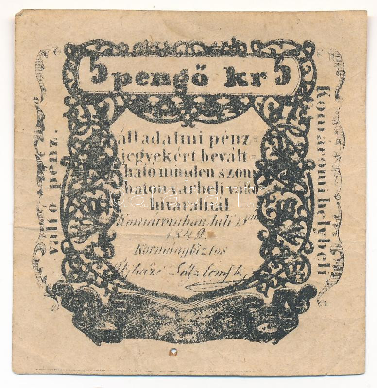 Komárom 1849. 5kr 2mm-es betűk T:F tűlyuk / Hungary / Komárom 1849. 5 ...