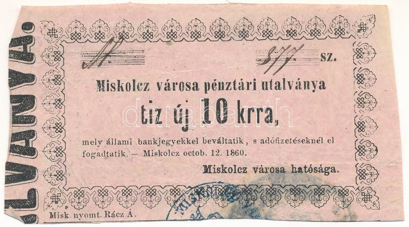Miskolc 1860. 10kr "Miskolcz város utalványa" rózsaszín papí...