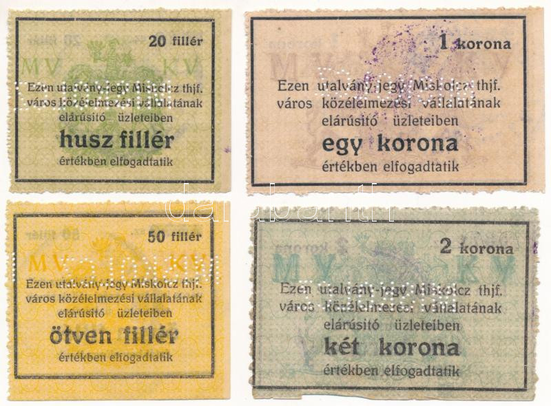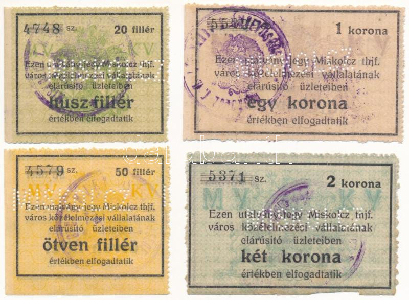 Miskolc ~1918-1919. 20f + 50f vízjeles papíron + 1K + 2K vízjeles papíron ,"Miskolcz thjf." utalvány-jegy, mind "MISKOLCZ" perforációval, bélyegzéssel T:AU,XF