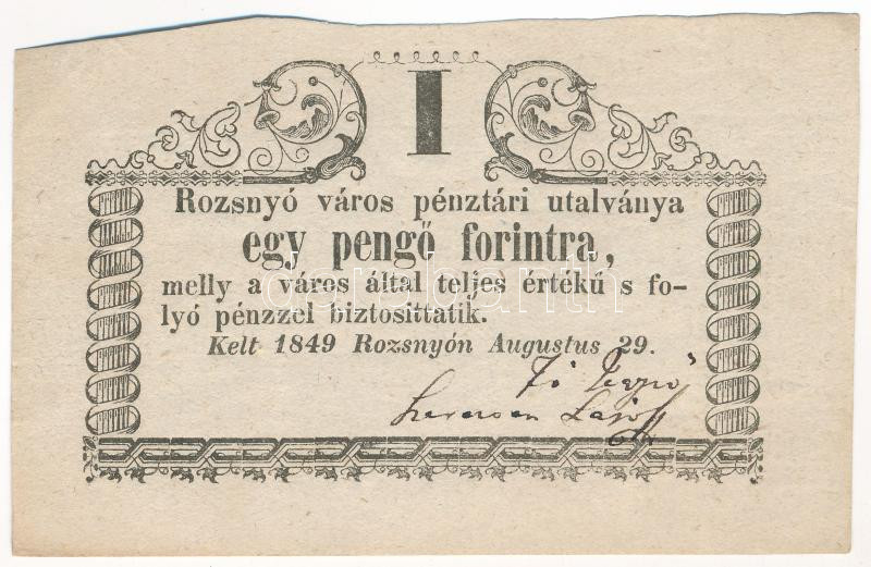 Rozsnyó 1849. 1Ft "Rozsnyó város pénztári utalványa" T:F szé... https://www.darabanth.com/en/469-Online-auction/469.0/Numismatics/Emergency-Coins-and-Notes~2000007/Rozsnyo-1849-1Ft-Rozsnyo-varos-penztari-utalvanya-TF-szep-papir-Hungary-Rozsnyo-1849~II3162075