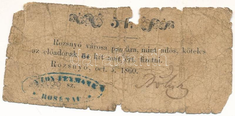 Rozsnyó 1860. 5kr "Rozsnyó város pénztára, mint adós" T:G Ad...