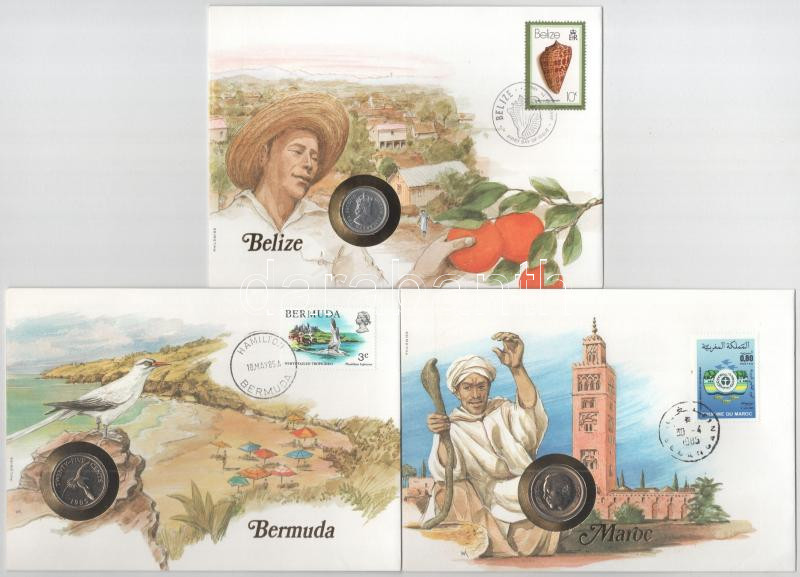 3xklf érmés boríték tétel, mind német nyelvű tájékoztatóval, benne: Belize, Bermuda, Marokkó