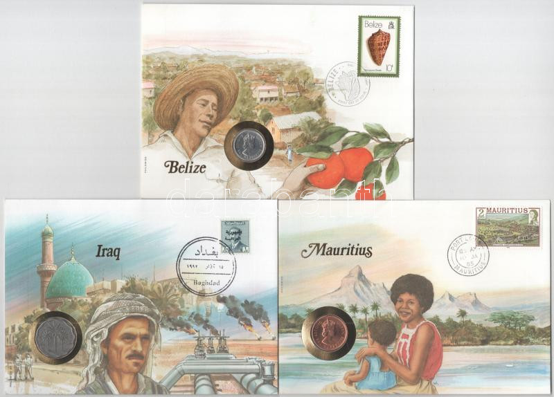 3xklf érmés boríték tétel, mind német nyelvű tájékoztatóval, benne: Belize, Irak, Mauritius