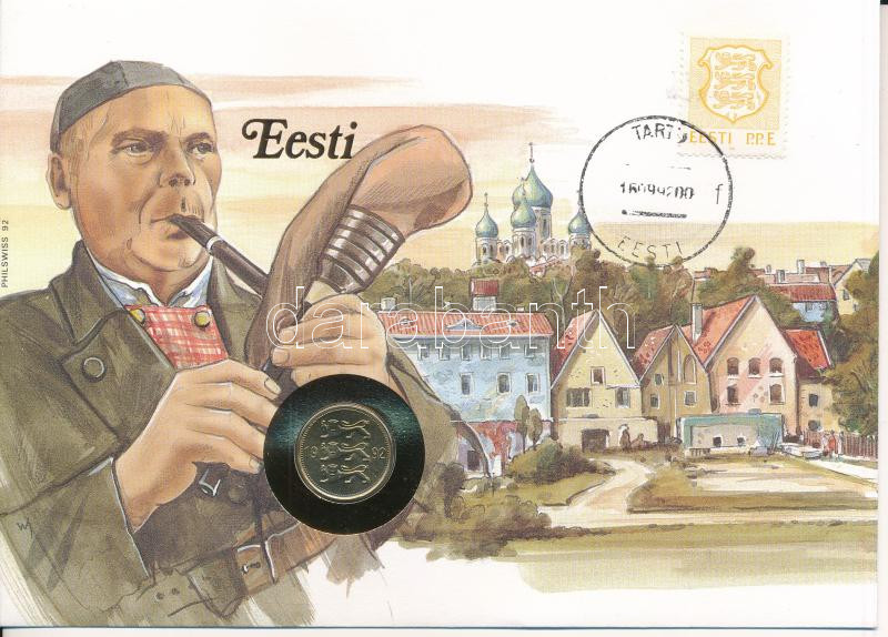 Description: Észtország 1992. 50s Cu-Al-Ni felbélyegzett borítékban, bélyegzéssel, német nyelvű tájékoztatóval T:UNC Estonia 1992. 50 Senti Cu-Al-Ni in envelope with stamp, cancellation and a prospectus in german C:UNC