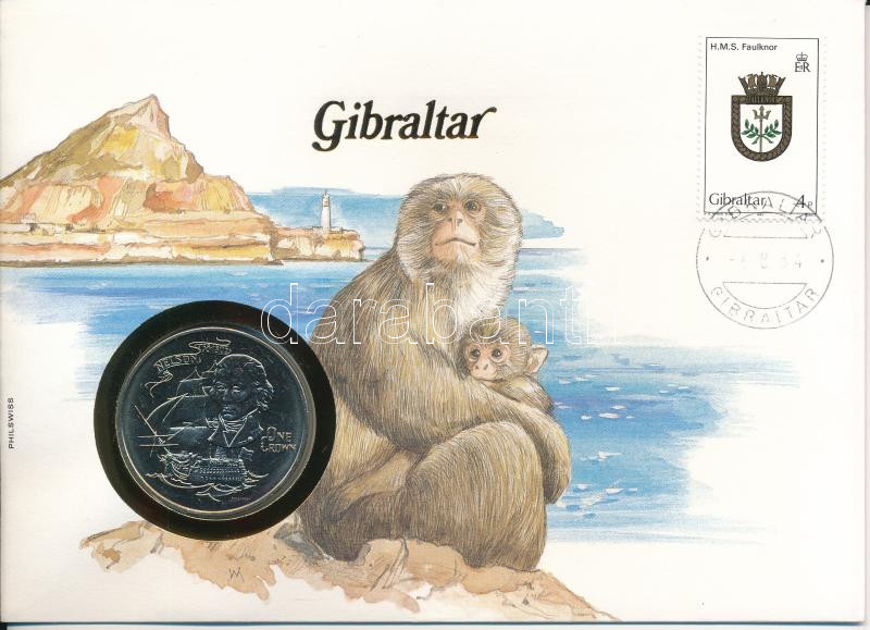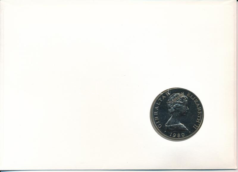 Gibraltár 1980. 1C Cu-Ni "Horatio Nelson halálának 175. évfordulója" forgalomba nem került emlékkiadás felbélyegzett borítékban, bélyegzéssel, német nyelvű leírással T:AU Gibraltar 1980. 1 Crown Cu-Ni "175th Anniversary of the death of Lord Horatio Nelson" non-circulating commemorative coin in envelope with stamp, cancellation, and a description in german C:AU Krause KM#12