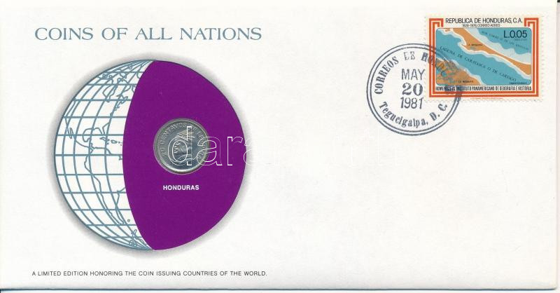 Description: Honduras 1973. 20c "Nemzetek pénzérméi" felbélyegzett borítékban, bélyegzéssel T:AU