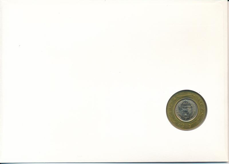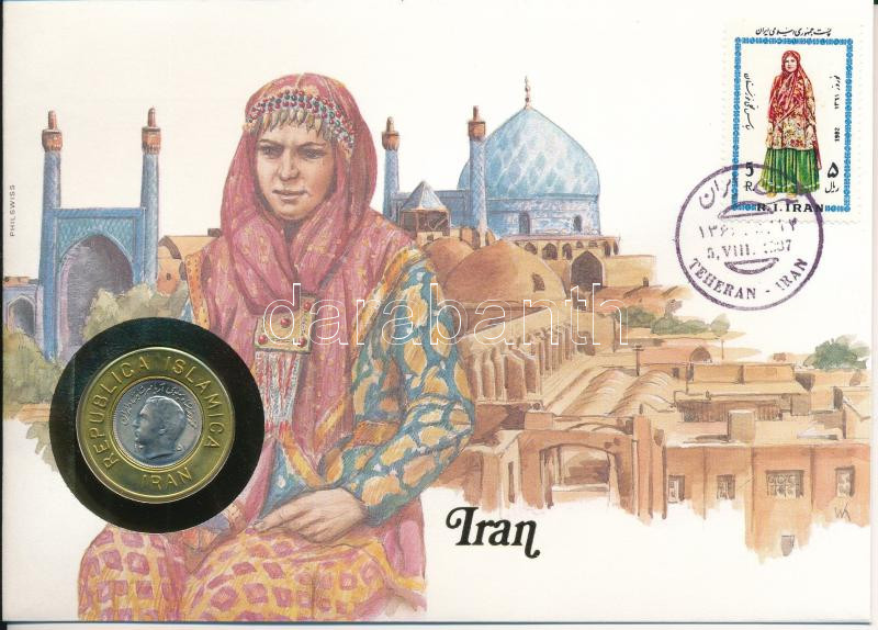Description: Irán 1972. 1R Cu-Ni "Mohammad Reza" réz "Republica Islamica Iran" gyűrűbe foglalva felbélyegzett borítékban, bélyegzéssel, német nyelvű tájékoztatóval T:UNC