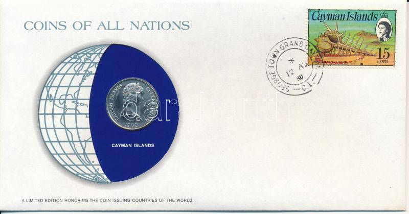 Description: Kajmán-szigetek 1980. 25c "Nemzetek pénzérméi" felbélyegzett borítékban, bélyegzéssel T:UNC