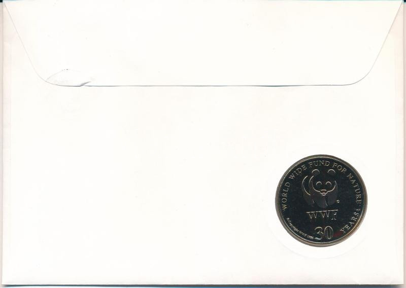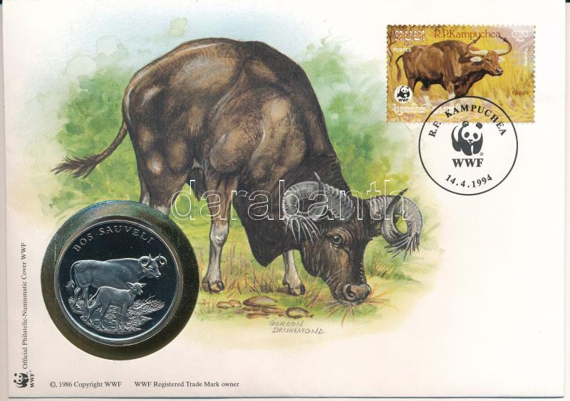 Kambodzsa DN (1991) "A Világ Vadvédelmi Alap (WWF) 30. évfordulója - Bos Sauveli (Kouprey)" kétoldalas fém emlékérem érmés borítékban, bélyeggel és bélyegzéssel, német nyelvű ismertetővel T:UNC Cambodia ND (1991) "30th Anniversary of the World Wildlife Fund - Bos Sauveli" two-sided metal commemorative medallion in envelope with stamp and cancellation, with German description C:UNC
