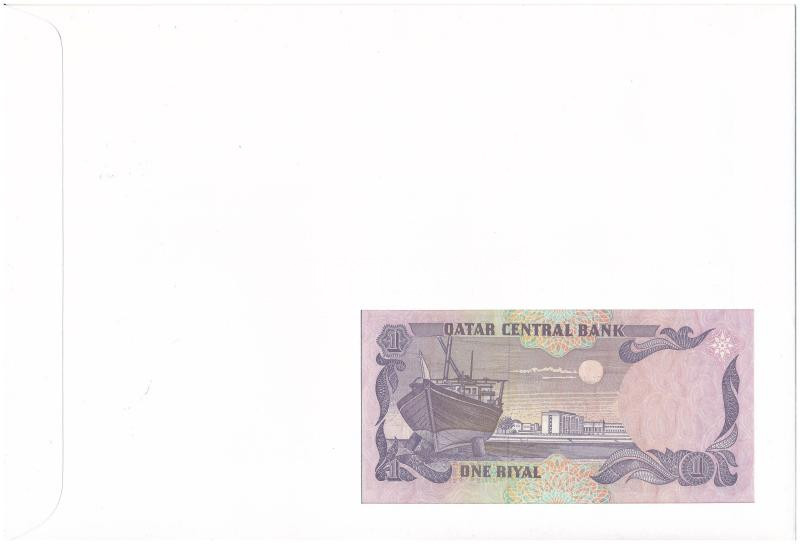 Qatar 1996. 1 Riyal in envelope with stamps and cancellations C:UNC