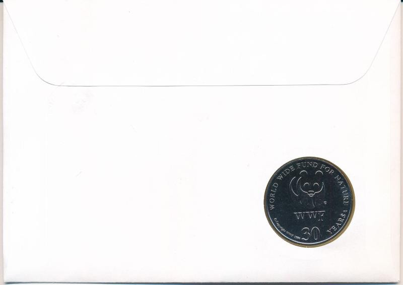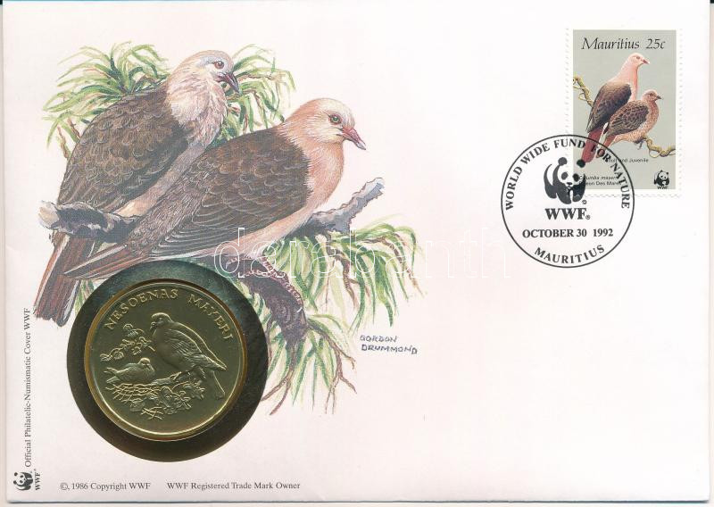 Mauritius DN (1991) "A Világ Vadvédelmi Alap (WWF) 30. évfordulója - Neoenas Mayeri (Rózsás galamb)" kétoldalas fém emlékérem érmés borítékban, bélyeggel és bélyegzéssel, német nyelvű ismertetővel T:UNC Mauritius ND (1991) "30th Anniversary of the World Wildlife Fund - Neoenas Mayeri" two-sided metal commemorative medallion in envelope with stamp and cancellation, with German description C:UNC