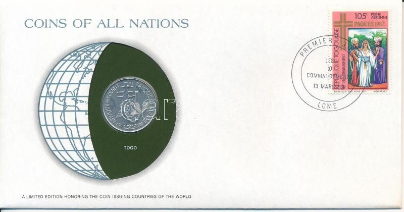 Description: Togo 1976. 100Fr "Nemzetek pénzérméi" felbélyegzett borítékban, bélyegzéssel T:UNC,AU