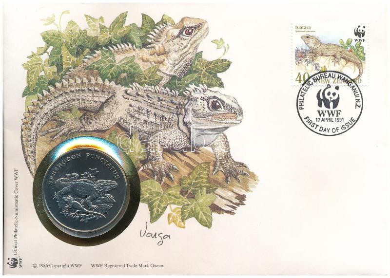 Új-Zéland DN (1991) "A Világ Vadvédelmi Alap (WWF) 30. évfordulója - Sphenodon Punctatus (Hidasgyík)" kétoldalas fém emlékérem érmés borítékban, bélyeggel és bélyegzéssel, német nyelvű ismertetővel T:PP