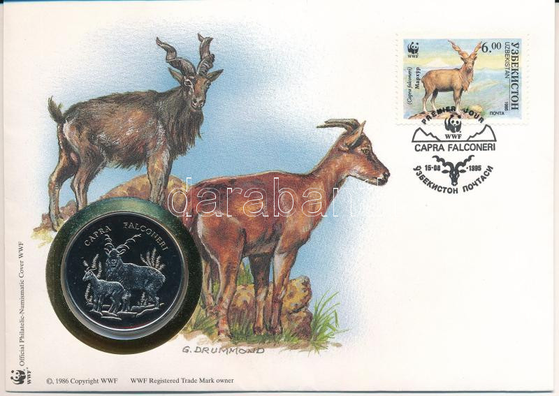 Üzbegisztán DN (1991) "A Világ Vadvédelmi Alap (WWF) 30. évfordulója - Capra Falconeri (Pödröttszarvú kecske)" kétoldalas fém emlékérem érmés borítékban, bélyeggel és bélyegzéssel, német nyelvű ismertetővel T:UNC Uzbekistan ND (1991) "30th Anniversary of the World Wildlife Fund - Capra Falconeri" two-sided metal commemorative medallion in envelope with stamp and cancellation, with German description C:UNC