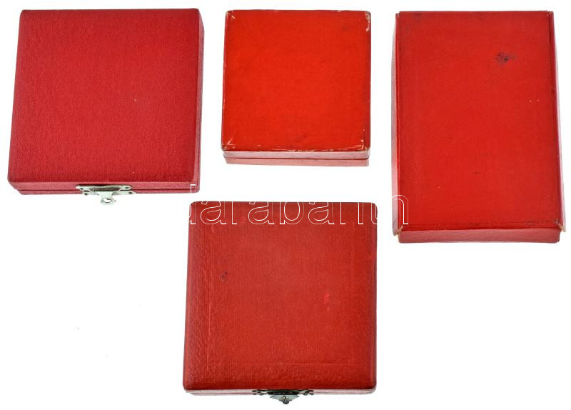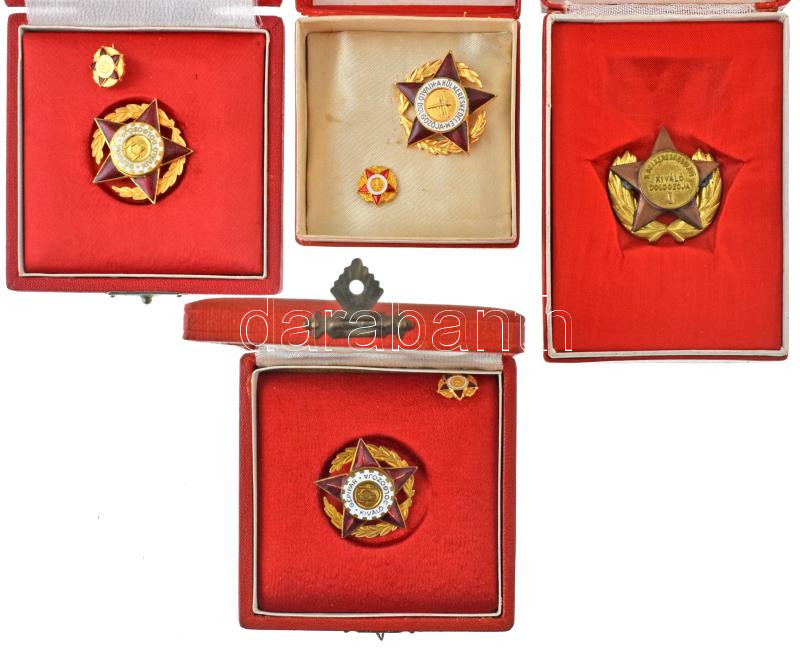 1953. "A belkereskedelem kiváló dolgozója" rátétes, részben aranyozott kitüntető jelvény tokban (35x35mm) + ~1970. "A Külkereskedelem Kiváló Dolgozója" aranyozott, zománcozott kitüntető jelvény miniatűrrel, tokban + "Gépipar Kiváló Dolgozója" zománcozott fém kitüntető jelvény miniatűrrel, eredeti tokban (2x) T:AU-VF