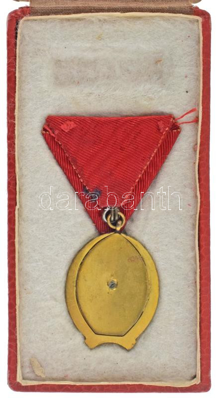 1954. "A Magyar Munka Érdemrend arany fokozata" aranyozott, zománcozott bronz kitüntetés mellszalagon, eredeti, sérült dísztokban, viselői igazolvánnyal (1950-es, ritkasugaras típus) T:XF Hungary 1954. "Hungarian Order of Labour - Gold Class" gold plated and enamelled bronze decoration on ribbon, in original damaged case, with bearer card (type 1950) C:XF NMK 598