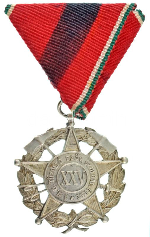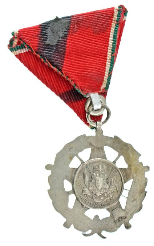 ~1884-1900. "A M. O. Tűzoltó Szövetség Szolgálati Érme 25 éves szolgálat után" hátoldalon jelzett Ag kitüntetés zománc nélkül, "S.J.L." gyártói jelzéssel, nem eredeti, modern mellszalagon (~16,30g/0.750/37mm) T:AU,XF / Hungary ~1884-1900. "Service medal for the Hungarian National Fireman's Alliance - 25 year" hallmarked Ag decoration without enamel, with "S.J.L." maker's mark, with not original, modern ribbon (~16,30g/0.750/37mm) C:AU,XF