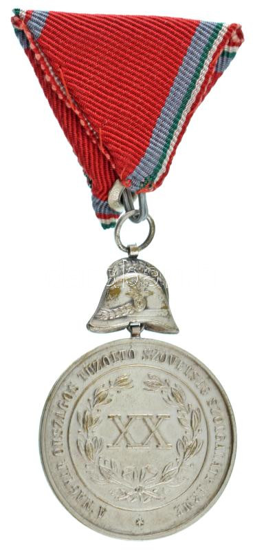 Description: ~1900. "A Magyar Országos Tűzoltó Szövetség XX éves Szolgálati Érme" ezüstözött bronz kitüntetés tűzoltósisakkal, nem eredeti mellszalagon T:AU kissé kopott ezüstözés