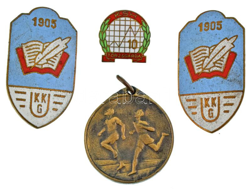 ~1930-1940. "KKG 1905 (Könyves Kálmán Gimnázium)" zománcozott sapkajelvény (42,5x24mm) + "KSH Törzsgárda 10" zománcozott bronz jelvény + bronz futó díjérem T:VF zománchiba