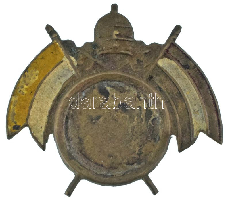 ~1930. Vatikáni és magyar zászlóval, pápai tiarával díszített, festett bronz jelvény tű nélkül, hiányos medallionnal T:VF