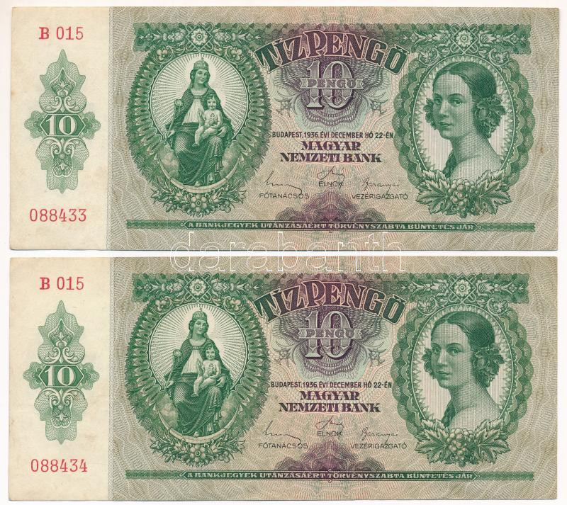 1936. 10P (2x) sorszámkövetők "B 015 088433 - B 015 088434" T:VF,F szép papír