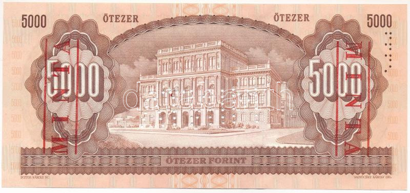 Description: 1990. 5000Ft "H 00000845" sorszámmal, piros "MINTA" felülnyomással és perforációval, nyomdai papírráncokkal T:UNC,AU / Hungary 1990. 5000 Forint with "H 00000845" serial number and with red "MINTA" (SPECIMEN) overprint and perforation, with typograhpical creases C:UNC,AU Adamo F49M