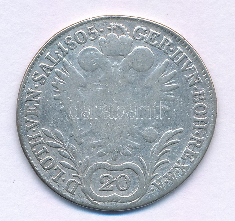 https://www.darabanth.com/en/469-Online-auction/469.0/Numismatics/Hungarian-coins-and-coins-with-Hungarian-mint-marks~2000009/1805B-20kr-Ag-I-Ferenc-TF-Hungary-1805B-20-Kreuzer-Ag-Franz-I-CF-Krause-KM232140-Unger-III-~II3130941