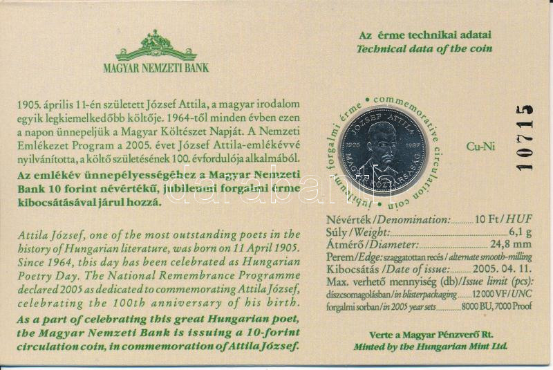 2005. 10Ft Cu-Ni "József Attila" sorszámozott emléklapon, "10715" sorszámmal T:UNC