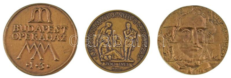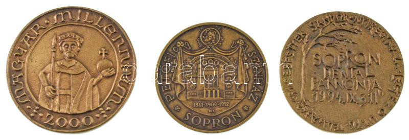 Description: 3db klf emlékérem, közte Soltra E. Tamás 1992. "200 éves a soproni magyar nyelvű színjátszás / Petőfi Színház Sopron" bronz emlékérem (42,5mm) + Asszonyi Tamás (1942-) 2000. "Magyar Millenium / Budapest Operaház" öntött bronz emlékérem (49mm) + 1994. "Gróf Széchenyi István / Sopron Dental Pannonia 1994 " kétoldalas öntött bronz emlékérem (46mm) T:AU