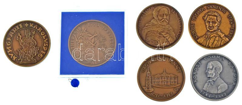 6db-os emlékérem-tétel, közte Bognár György (1944-) 1992. "Magyarok III. Világkongresszusa / Kőrösi Csoma Sándor" bronz emlékérem (42,5mm) + Bognár György (1944-) 1985. "40 éves a BÁV" kétoldalas bronz emlékérem, sérült, plombált plasztik tokban (42,5mm) + Bognár György (1944-) 1987. "Kőrösi Csoma Sándor 1784-1842 / Magyar Mezőgazdasági Múzeum Baráti Körének Szécsényi Csoportja - Kőrösi Csoma Sándor Emlékmúzeum megnyitása Szécsény" ezüstpatinázott bronz emlékérem (42,5mm) + 3xklf "Szécsény" témájú bronz emlékérem (42,5mm) T:UNC-XF