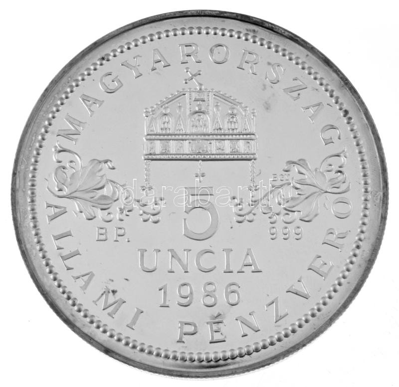 Bognár György (1944-) 1986. "Magyarország - Állami Pénzverő - 5 uncia 1986" Ag emlékérem kapszulában (156,48g/0.999/65mm) T:PP ujjlenyomat, peremen patina Hungary 1986. "Hungary - National Mint - 5 uncia 1986" Ag commemorative medallion in capsule (156,48g/0.999/65mm) C:PP fingerprint, patina on edge