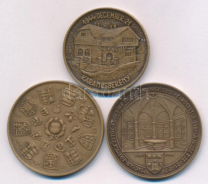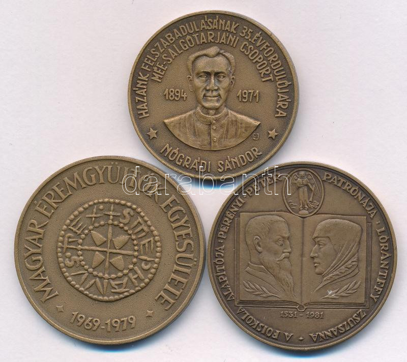 Csucs Viktória (1934-1993) 1979. "Magyar Éremgyűjtők Egyesülete 1969-1979" kétoldalas bronz emlékérem (42,5mm) + Garamkeszi János (1936-2014) 1971. "Hazánk felszabadulásának 35. évfordulójára MÉE Salgótarjáni csoport - Nógrádi Sándor / Karancsberény 1944" bronz emlékérem (38mm) + Kelemen Kristóf (1922-2001) 1981. "MÉE XI. Vándorgyűlése - Sárospatak / A főiskola alapítója: Perényi Péter - Patrónája: Lórántffy Zsuzsanna" kétoldalas bronz emlékérem (42,5mm) T:UNC,AU kis ph