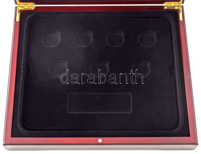 Description: Mahagóni fa érmetartó kazetta bársonybéléssel, 7db 30mm-es férőhelyű kivehető tálcával "A világ legkisebb aranyérméi" sorozat számára, új állapotban, kartondobozában.