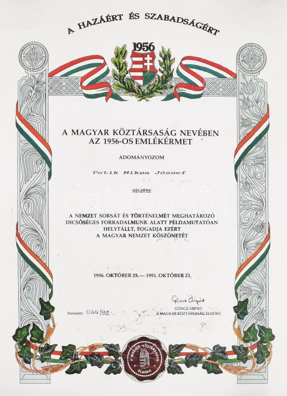 1992. "1956-os Emlékérem / A hazáért és a szabadságért" kitü...