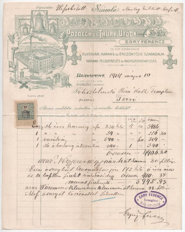Description: Budapest 1914. "Pozdech és Thury utóda Egry Ferencz Cs. Kir. Szabadalm. Fuvógyár, Harang és Érczöntöde Szabadalm. Harang Felszerelés és Nagyszerkovácsság" Forró település római katolikus temploma részére kitöltött számla okmánybélyeggel és bélyegzővel T:F