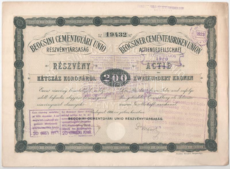 Budapest 1906. "Beocsini Cementgyári Unió Részvénytársaság" ... https://www.darabanth.com/en/469-Online-auction/469.0/Numismatics/Shares-and-Tickets~2000006/Budapest-1906-Beocsini-Cementgyari-Unio-Reszvenytarsasag-reszvenye-200K-rol-magyar-es-~II3175987