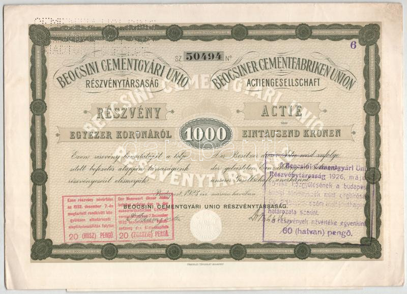 Budapest 1923. "Beocsini Cementgyári Unió Részvénytársaság" ... https://www.darabanth.com/en/469-Online-auction/469.0/Numismatics/Shares-and-Tickets~2000006/Budapest-1923-Beocsini-Cementgyari-Unio-Reszvenytarsasag-reszvenye-1000K-rol-magyar-es~II3072016