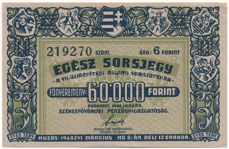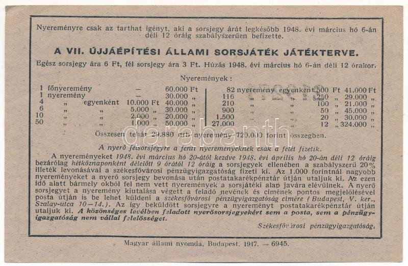 Budapest 1948. "Egész sorsjegy - VII. Újjáépítési Állami sorsjáté...