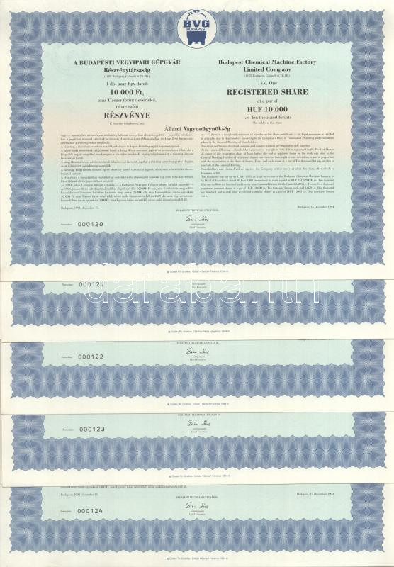 Budapest 1994. "Budapesti Vegyipari Gépgyár" részvénye 10.000Ft-ról szelvényekkel, (5x) sorszámkövetők T:AU