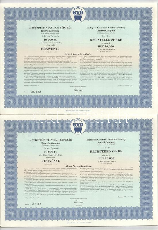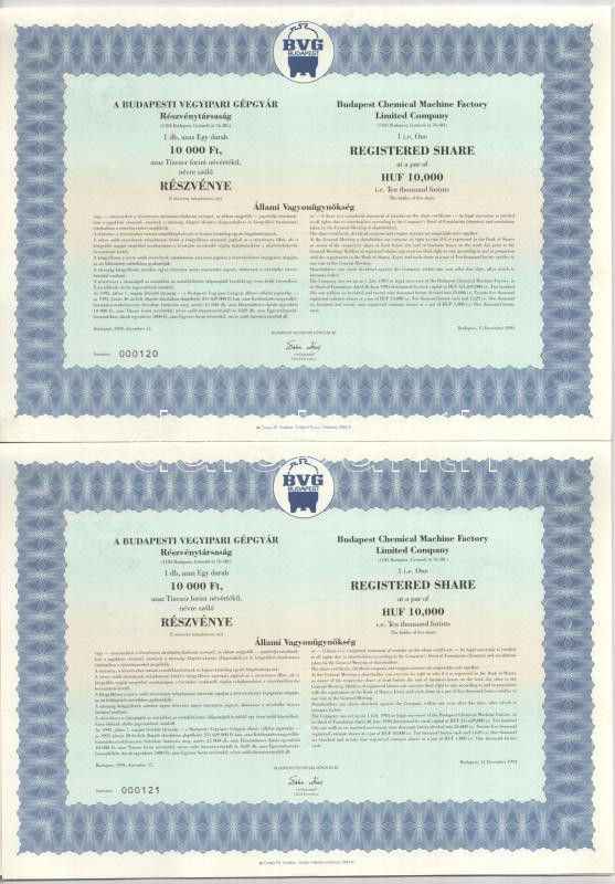 Budapest 1994. "Budapesti Vegyipari Gépgyár" részvénye 10.00...