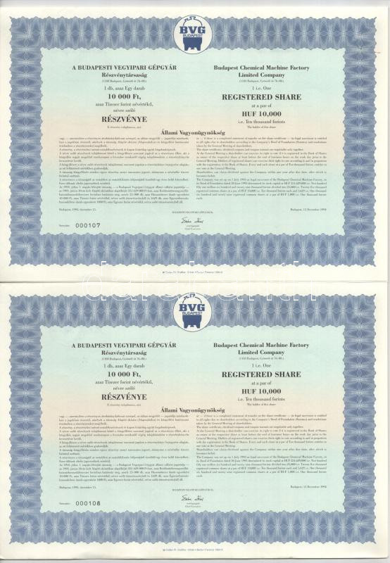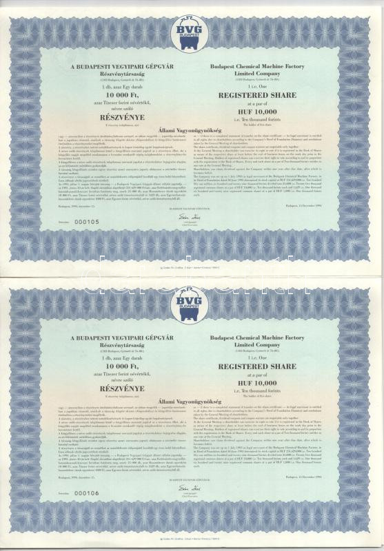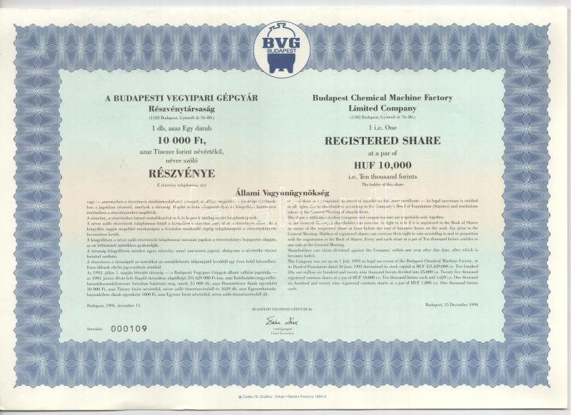 Budapest 1994. "Budapesti Vegyipari Gépgyár" részvénye 10.00...