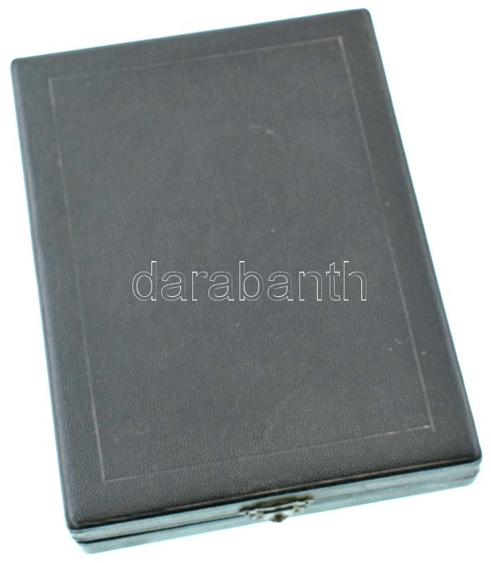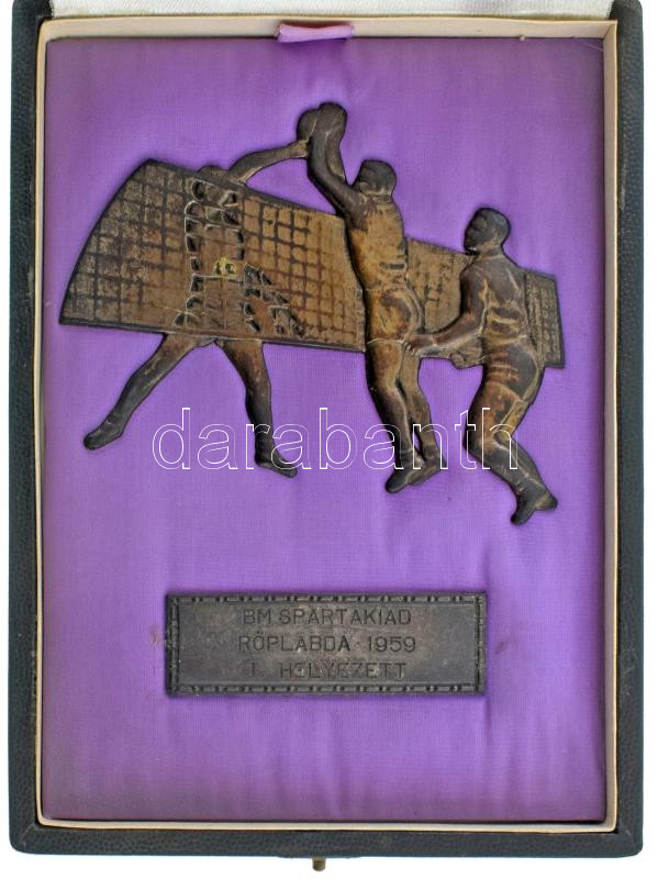Description: 1959. "BM. Spartakiad Röplabda - I. helyezett" ezüstözött bronz plakett az eredeti tokjához erősítve, gravírozott táblával (~100x113mm) T:XF kopott ezüstözés