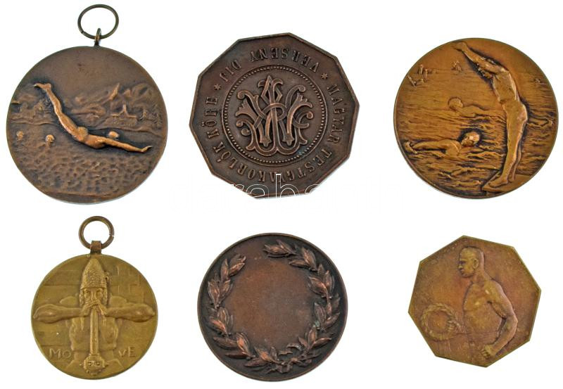 ~1910-1945. 6xklf bronz díjérem, nagyrészt úszás, közte ~1910. "Magyar Testgyakorlók Köre (MTK) - Verseny díj" kétoldalas bronz díjérem (40mm) T:AU-VF
