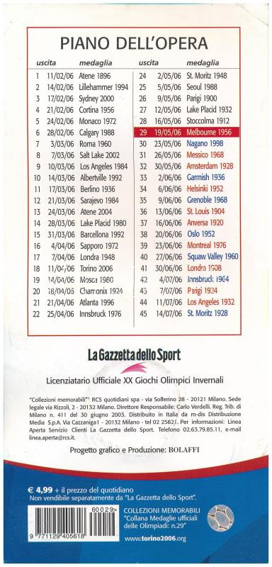 Italy 2006. gilt metal medallion with the logo of the Olympiad in Melbourne 1956, in original, but worn "Le Medaglie ufficiali delle Olimpiadi - 29. - Melbourne 1956" sheet (32mm) C:UNC