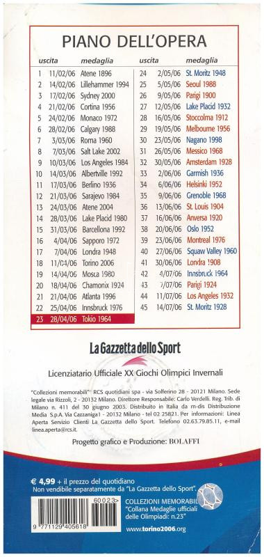 Olaszország 2006. aranyozott fém emlékérem az 1964-es tokiói Olimpia logójával, eredeti, de kissé viseltes "Az olimpia hivatalos érmei - 23. - Tokió 1964." díszlapon (32mm) T:UNC patina
